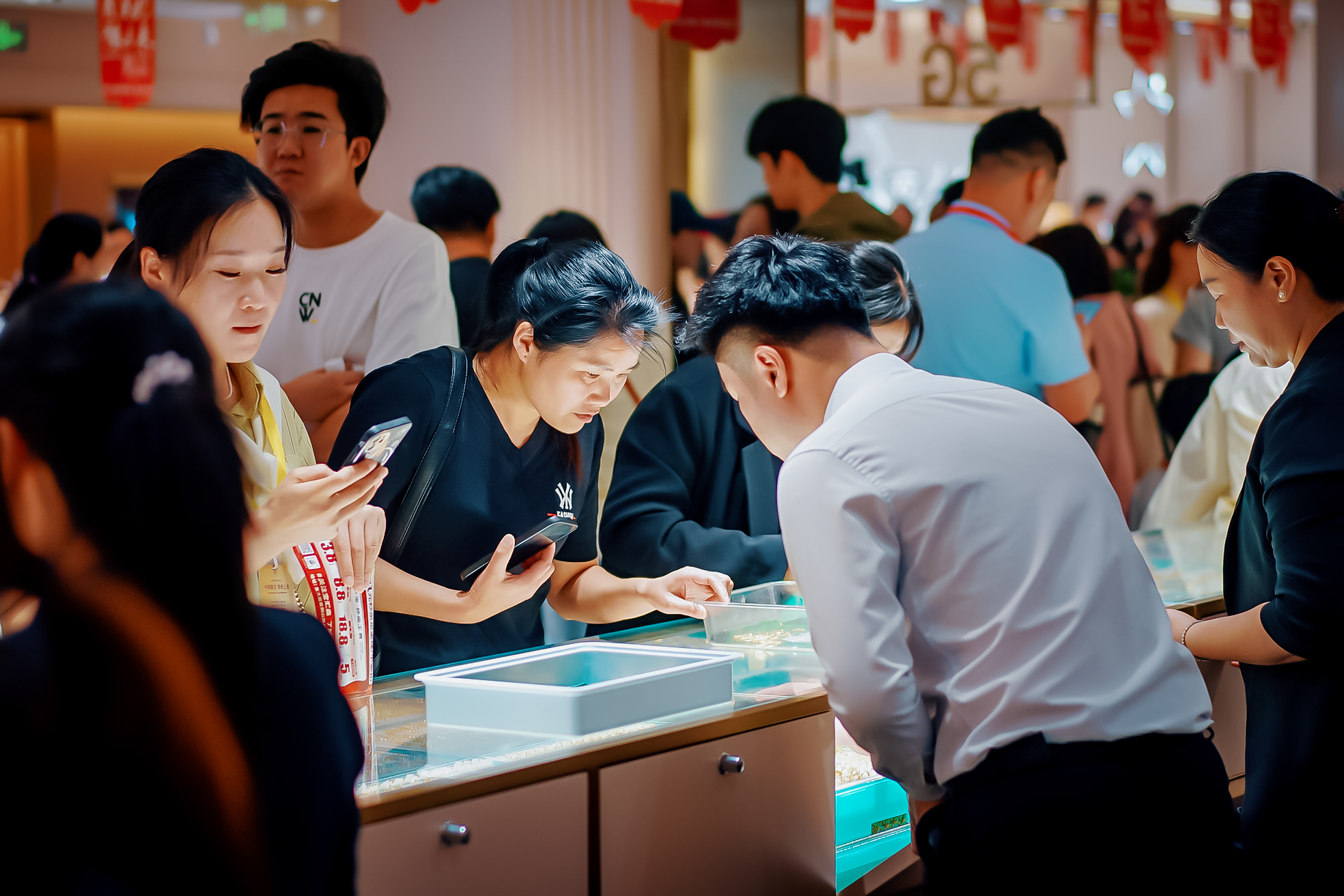 儀式結(jié)束后,嘉賓一行跟隨祥獅實地參觀寶匯鑫珠寶交易中心,現(xiàn)場人聲鼎沸,人潮嚷嚷......商場內(nèi)聚滿了前來的消費者